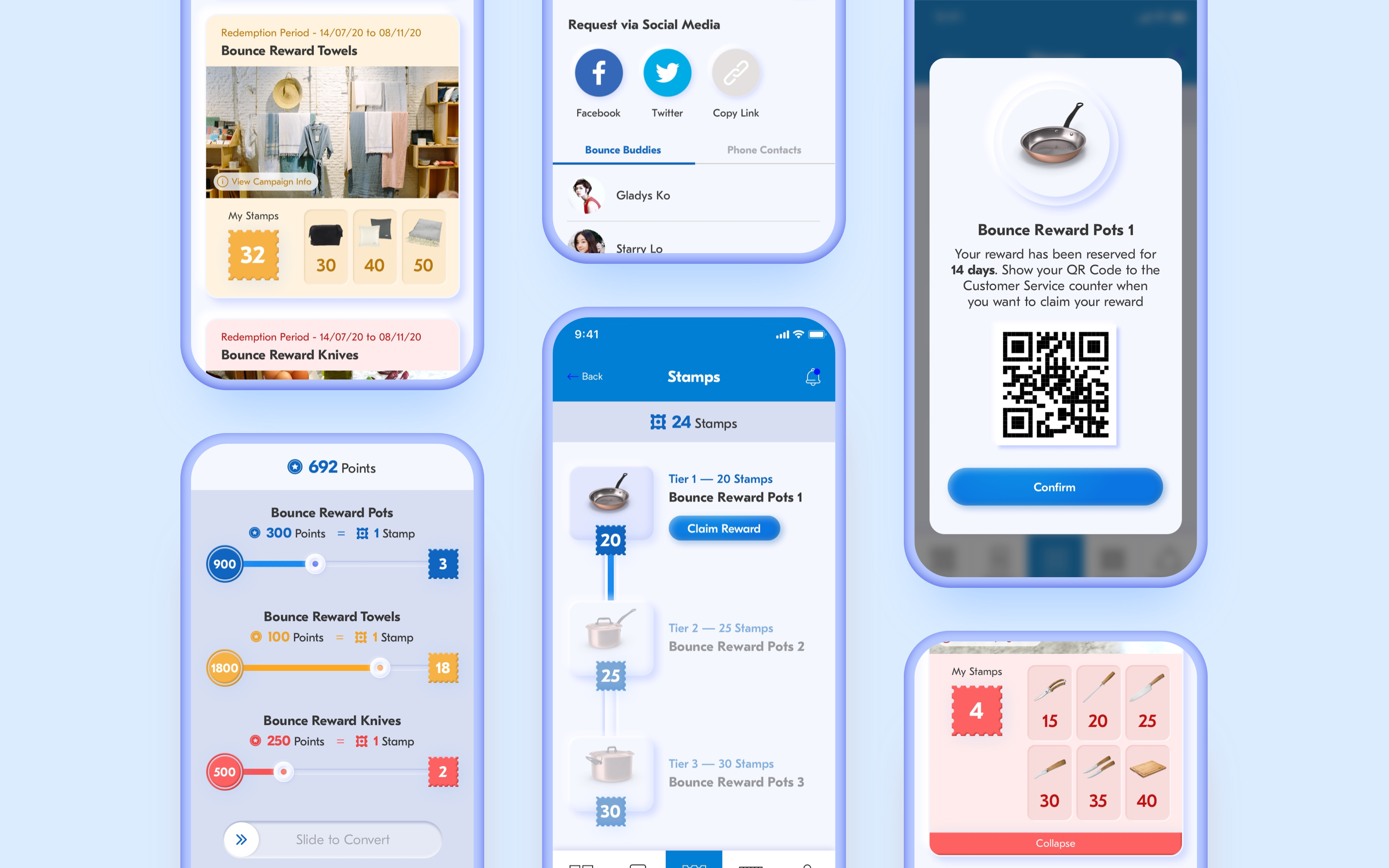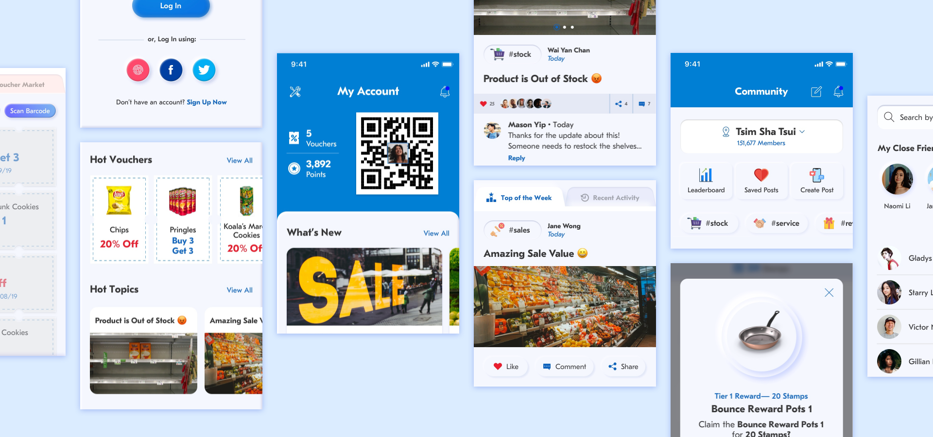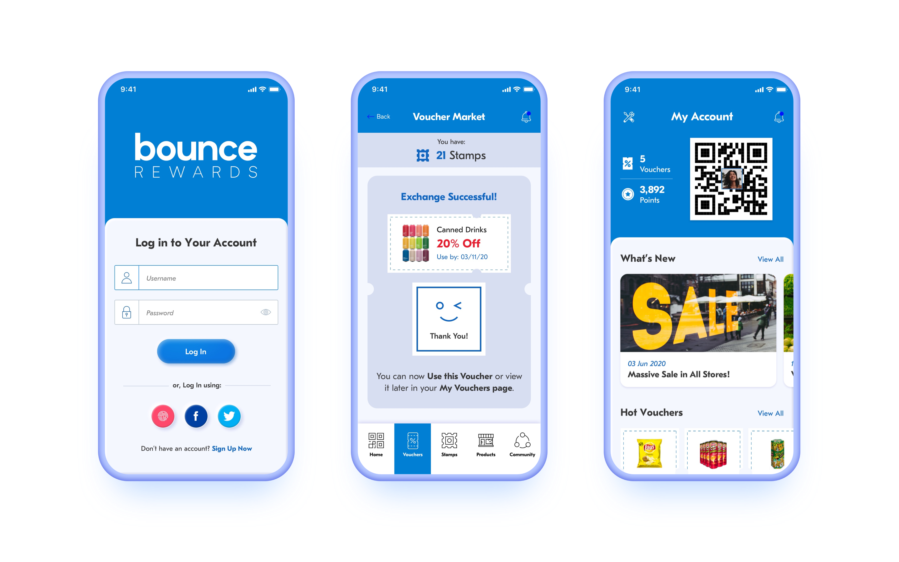 Bounce Rewards is a conceptual template that was designed to be sold as a marketing tool for large-scale supermarket chains. L - Founders of Loyalty is a company that specializes in creating rewards programs for major retailers, so I was tasked to design an app that would help supplement their reward schemes and generate customer interest and retention. I utilized a "neumorphic" design for the UI to give the app some texture and a friendlier feel; the faux-3D elements alongside the vibrant color scheme and cute illustrations made the app feel more approachable and easy to look at so that users would feel encouraged to use the app often.
