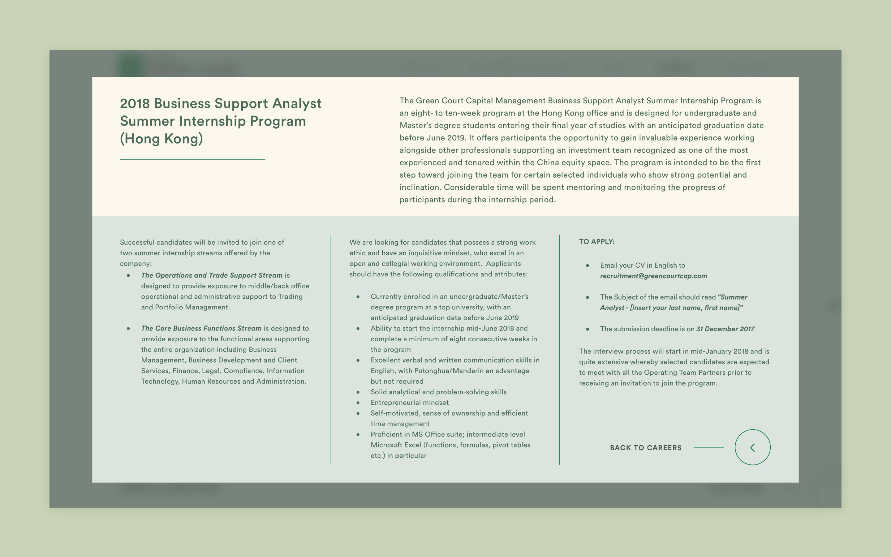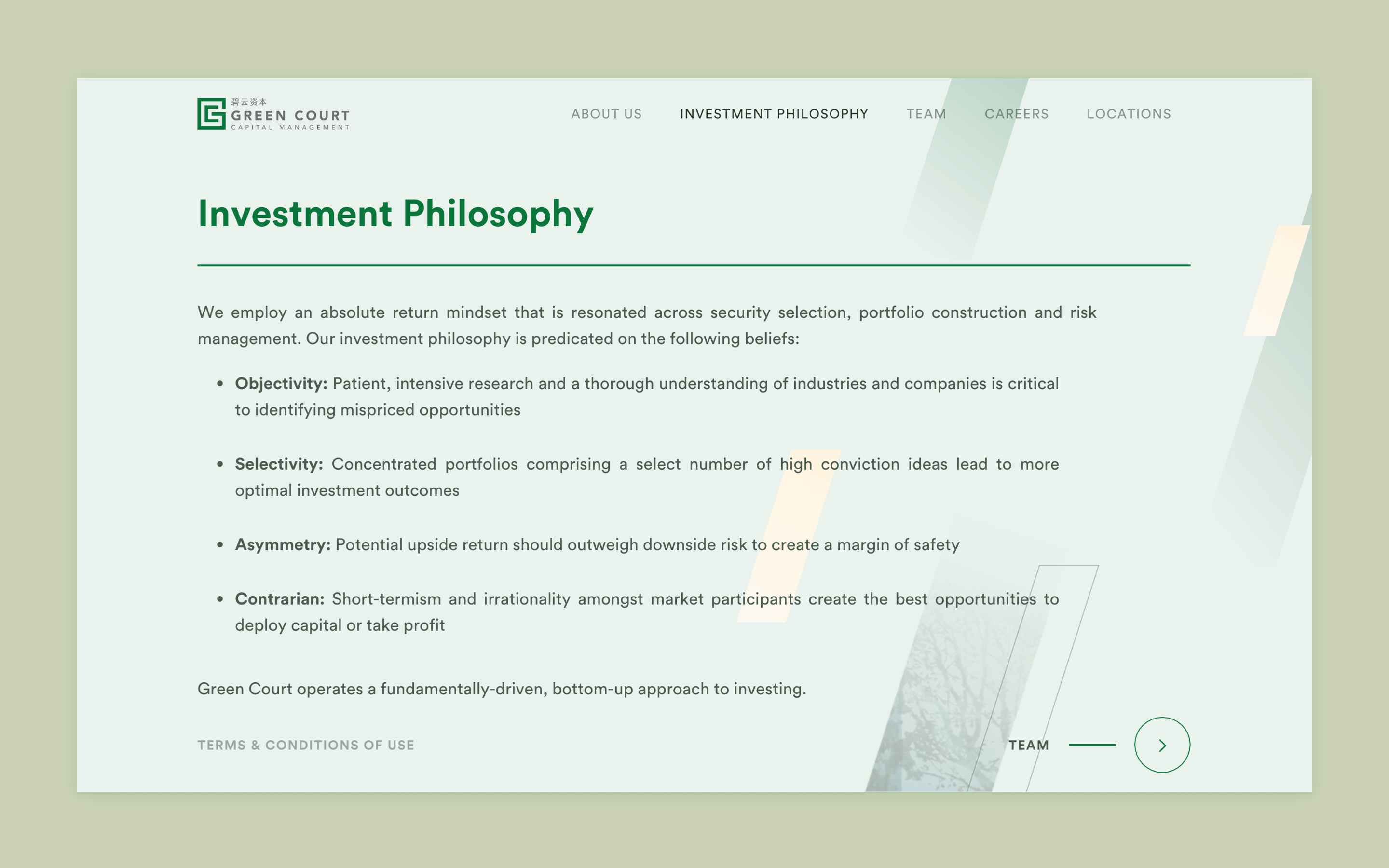 Green Court Capital Management is an investment firm that is focused on the Chinese market. They wanted to have a website that was abstract with unique graphical elements that separated them from the typical "investment firm" look.