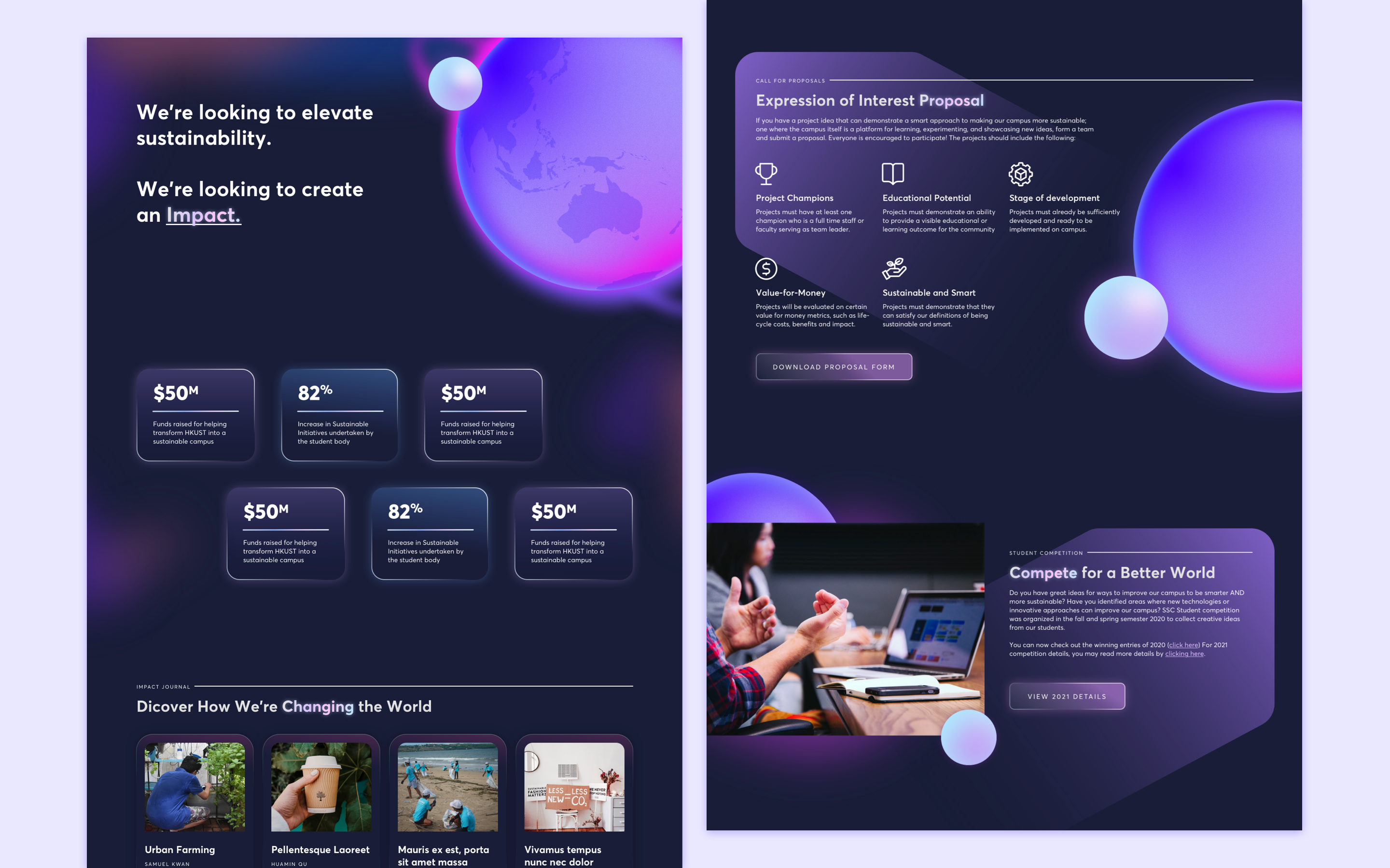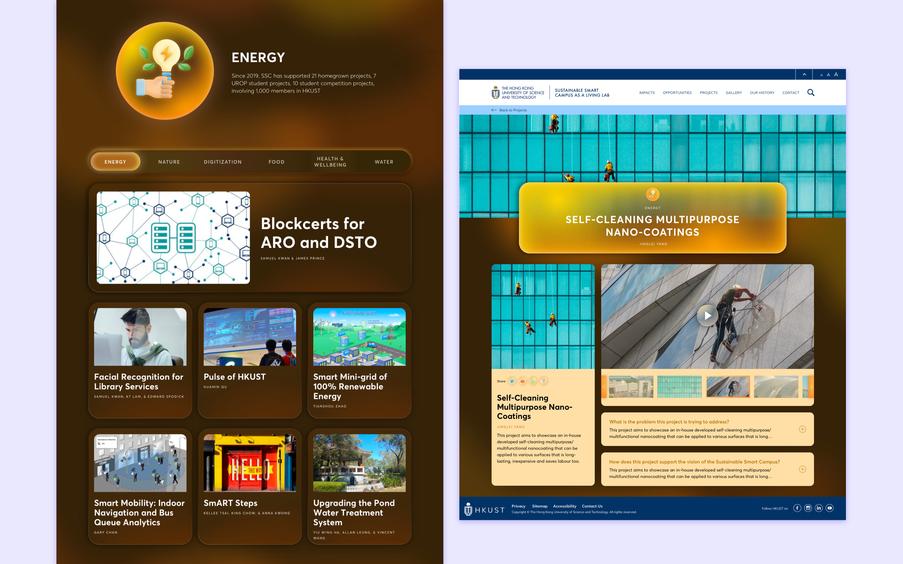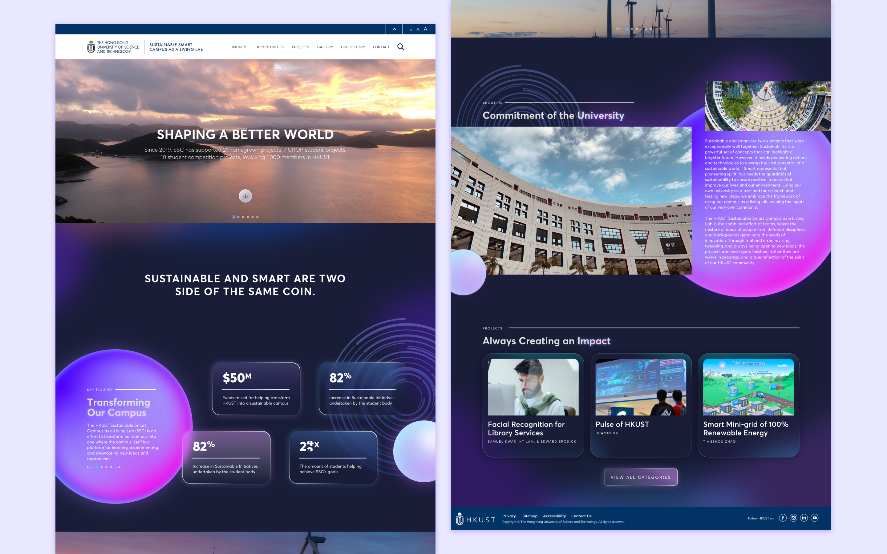The HKUST Sustainable Smart Campus as a Living Lab (SSC) is an initiative to transform the HKUST campus into a platform for learning, experimenting, and showcasing new ideas and approaches related to sustainability. I've had multiple experiences creating websites for various departments in HKUST before, but because this initiative is run by a younger, more progressive team, I was given the opportunity to break out of their usual "corporate identity". This meant I could design something that stood out from the regular cookie-cutter HKUST websites, looked futuristic and tech-oriented, and had more creative direction on how the department was to look, as a brand, to the general student body. I also used this project as a chance to experiment with animated SVGs to see if it was easy to implement small-sized animated graphics to the website design.