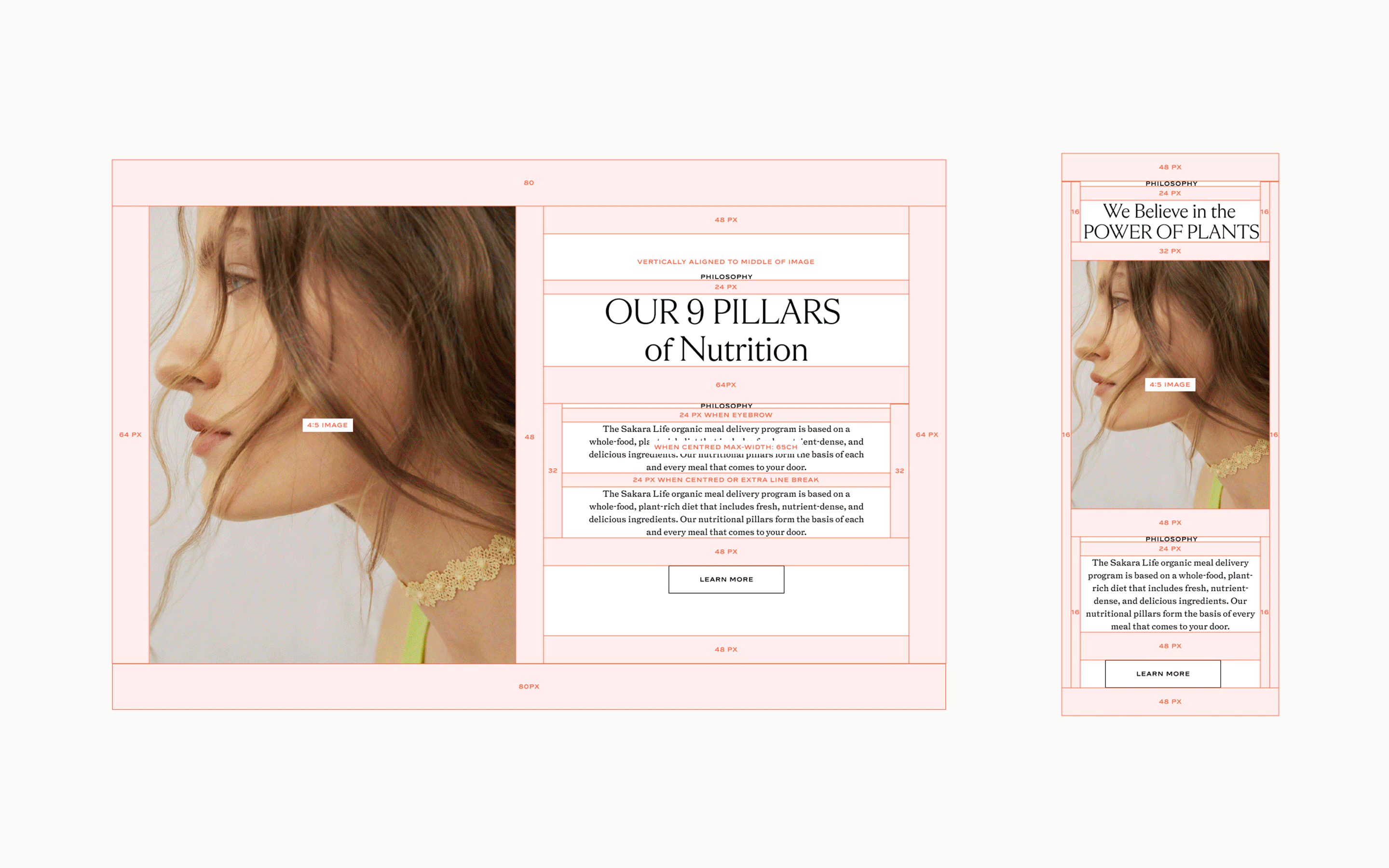 With that in mind, we built a fully modular system that allowed us the flexibility to create any page we wanted with any combination of modules that were created for the site. All of the modules were designed to cover every possible eventuality and we made sure to validate the design choices based on the initial research we've done and confirmation from what other cross-functional teams in Sakara needed for future campaigns and initiatives. We wanted to ensure that we avoided hard-coding anything and that the designs were future-proofed.