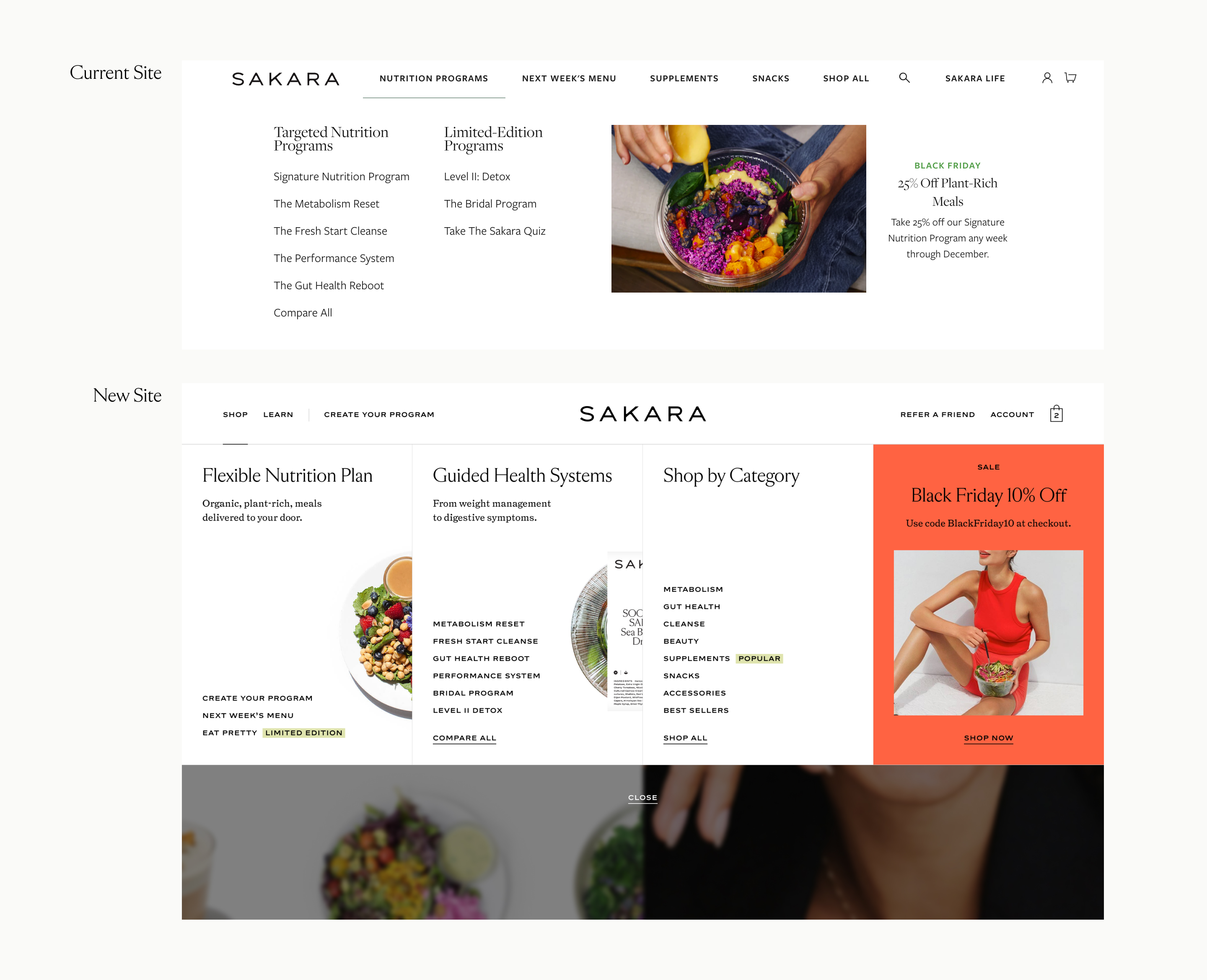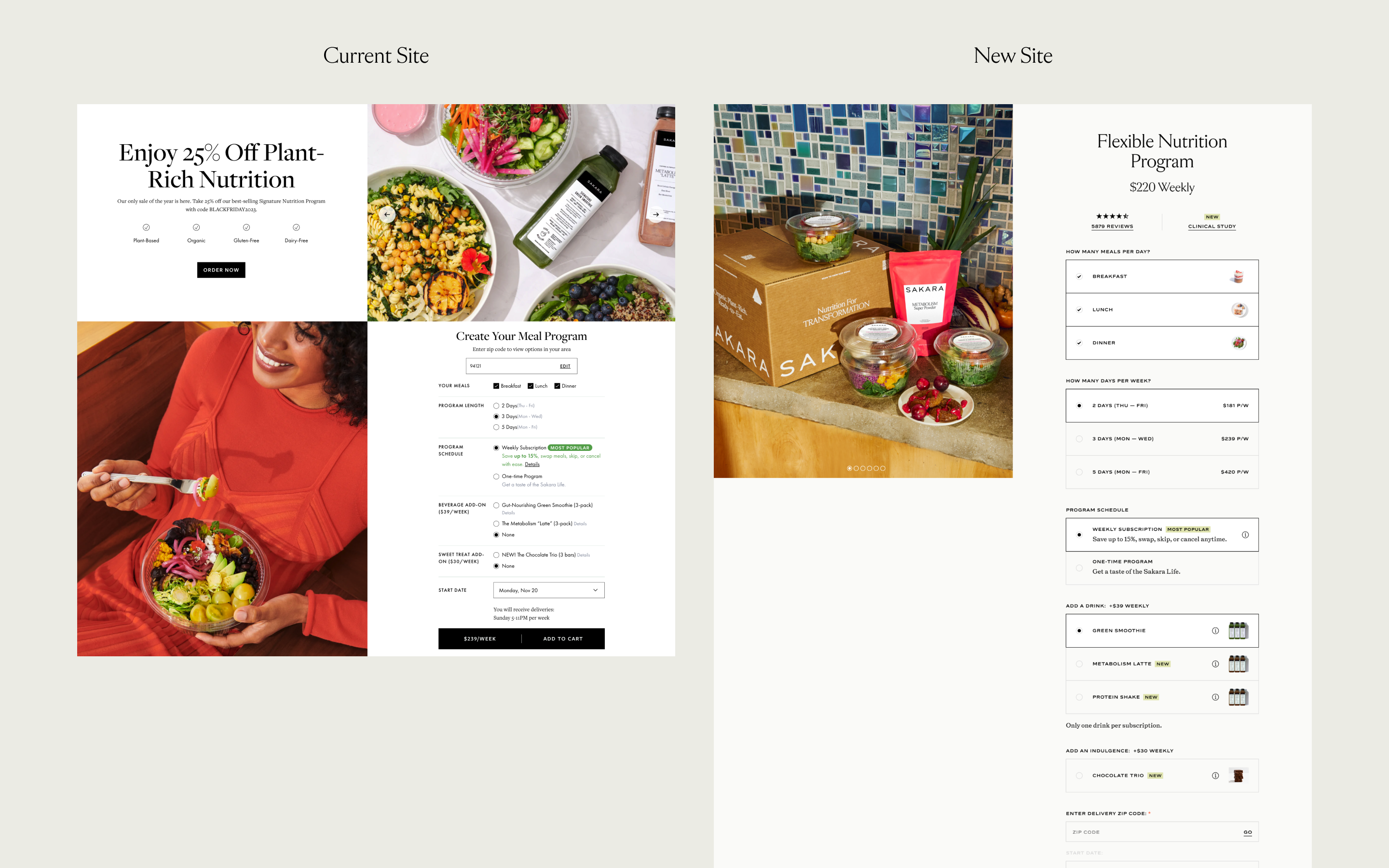 Surfaced Next Week's Menu With 16.5% of Homepage clicks leading to the Next Week's Menu page, we wanted to place it higher within the page hierarchy. Our design provided a quick "sneak peek" of the menu, highlighting the beautiful food photography of Sakara's meals, enticing users to click into the link to see the wealth of options that Sakara's menu provides