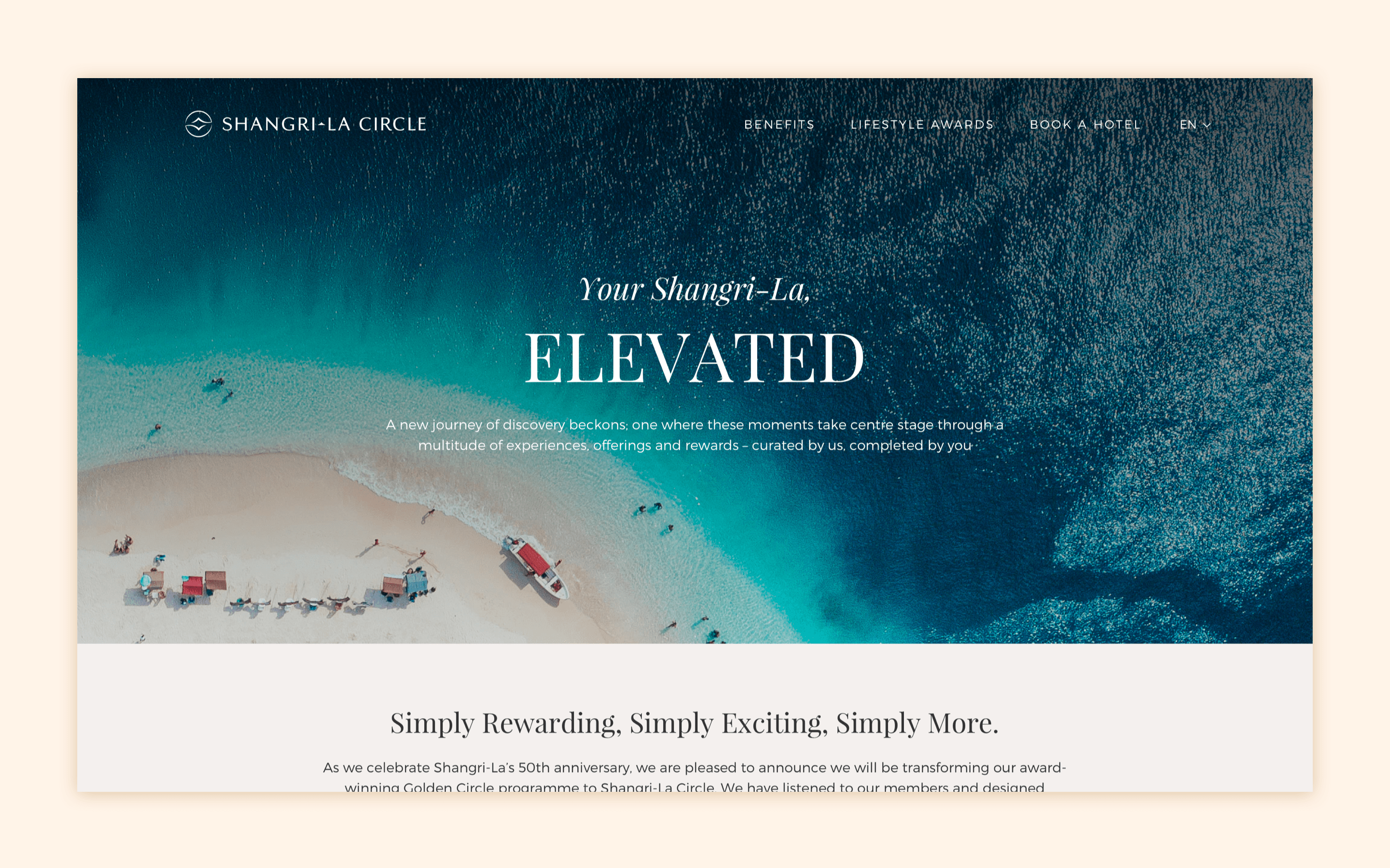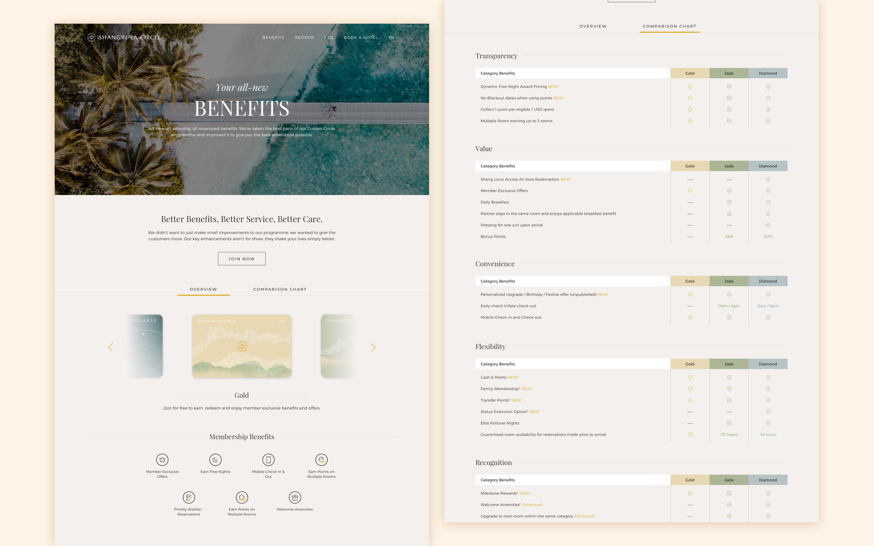 Shangri-La's rewards membership program, Golden Circle, has been around for several years and their digital platform lacked a modern aesthetic and suffered from a suboptimal user experience, hindering the growth of sign-ups. The goal was to revitalize the design, infusing it with a contemporary look and feel, while simultaneously optimizing the user journey to increase membership subscriptions.