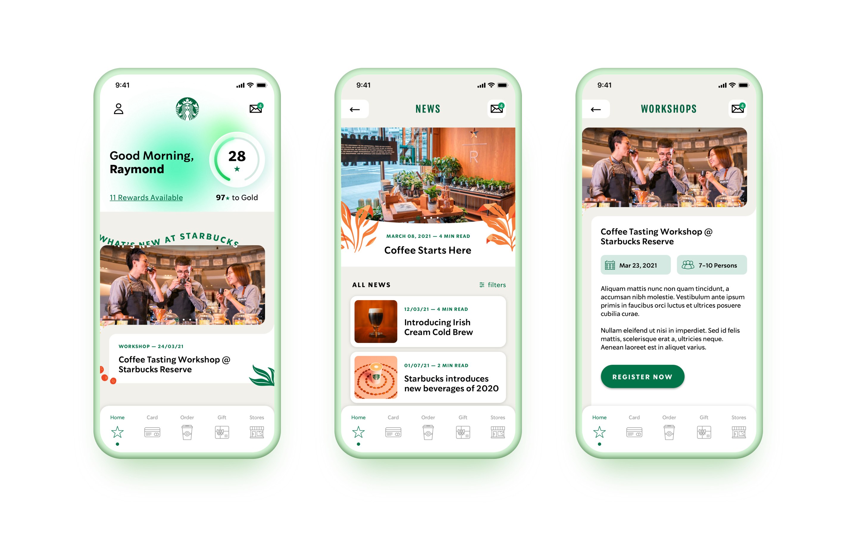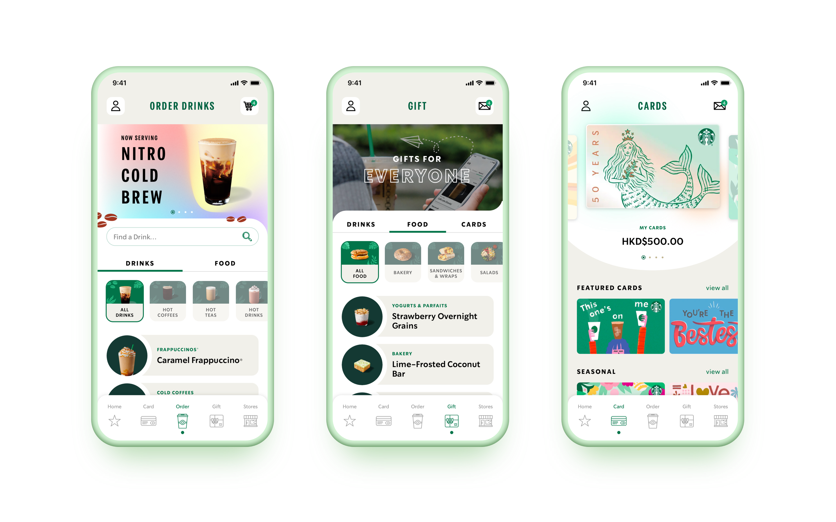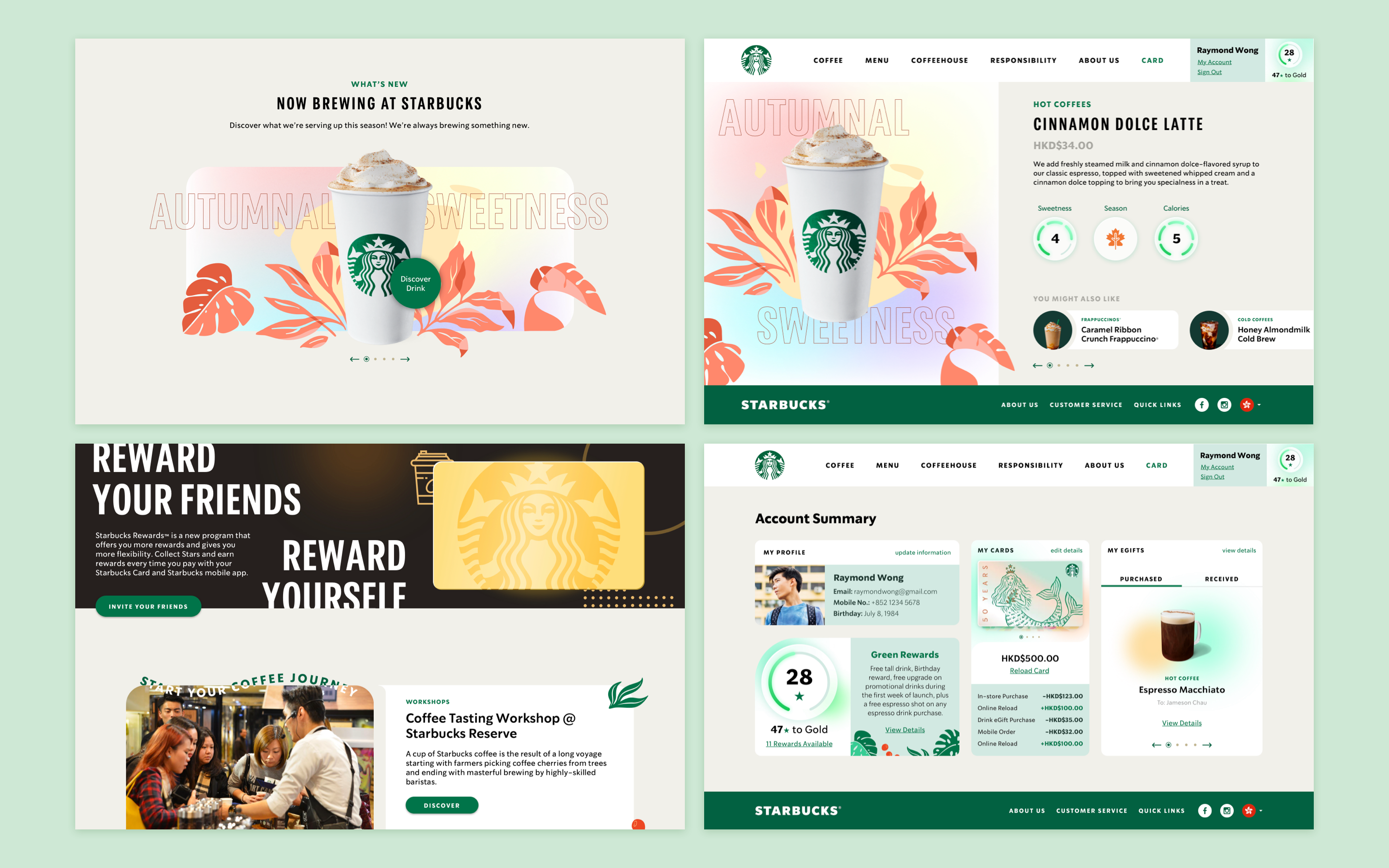 This was a design I made for a pitch to revamp Starbucks' app as well as its corresponding website in Hong Kong. While this project didn't end up going through (due to COVID), the design was received with positive reviews amongst the Starbucks Hong Kong team. For me, it was an enjoyable experience to explore Starbucks' more creative branding elements and it allowed me to have a little fun with the design; I made illustrations, tested graphical effects and gradients, experimented with irregular layouts, different methods of layering and new styles of UI, all in an effort to make something truly captivating, vibrant and entertaining for Starbucks customers to use.